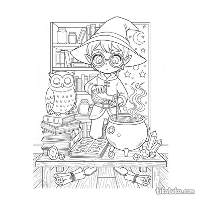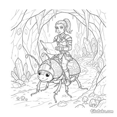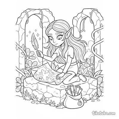 Die Fantasy-Sektion umfasst 147 Ausmalbilder mit Motiven aus märchenhaften und magischen Welten. Neben klassischen Figuren wie Feen, Kobolden und Nymphen finden sich hier auch ungewöhnliche Charaktere: ein Kristallfuchs-Welpe in einer Geodenhöhle, eine Sternen-Nymphe beim Weben eines Konstellations-Teppichs oder ein junger Lehrling, der im überfüllten Turm einen Trank mischt. Die Motive sind für Kinder unterschiedlichen Alters ausgelegt – von übersichtlichen Szenen für die Jüngsten bis hin zu detailreichen Zeichnungen für erfahrenere Ausmaler.