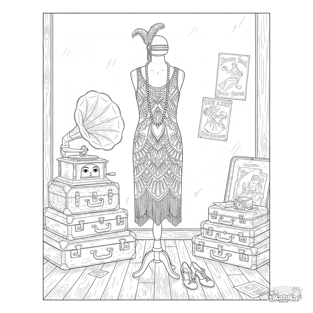 Komplexes Ausmalbild für 10-12 Jahre: Ein Vintage-Flapperkleid der 1920er auf einer Schaufensterpuppe. Detaillierte Szene mit Perlenstickerei, Federn, Grammophon und Schattenspiel.