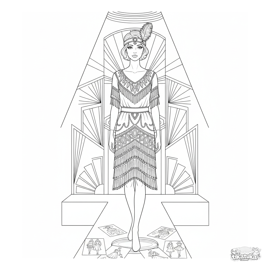 Ausmalbild für 10-12 Jahre: ein detailliertes 1920er Flapper-Kleid auf einem Mannequin, auf einem Laufsteg mit Art-Deco-Hintergrund.