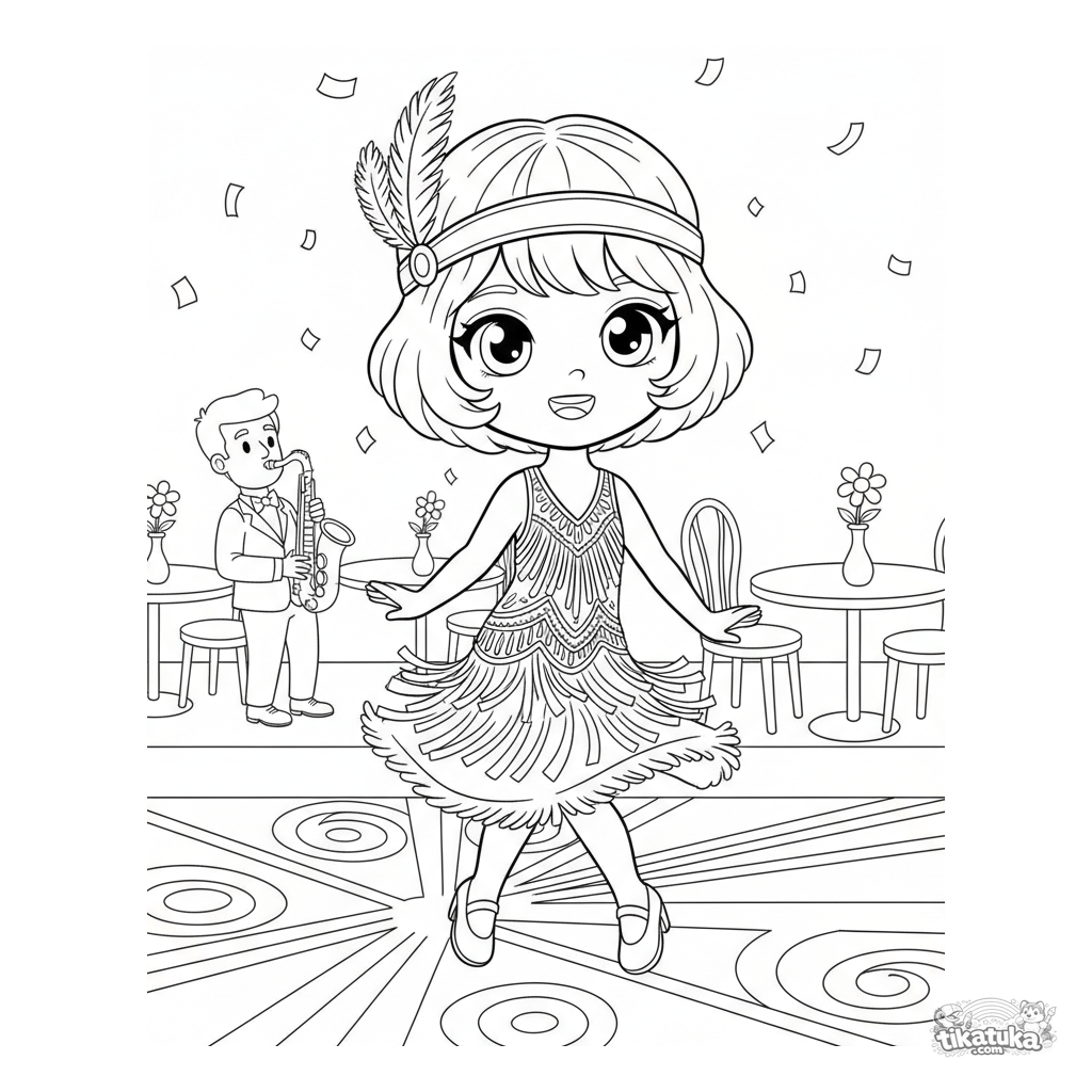 Ausmalbild für Mädchen 10-12: Ein Mädchen in einem detaillierten 1920er Flapper-Kleid wirbelt fröhlich auf der Tanzfläche einer Speakeasy.