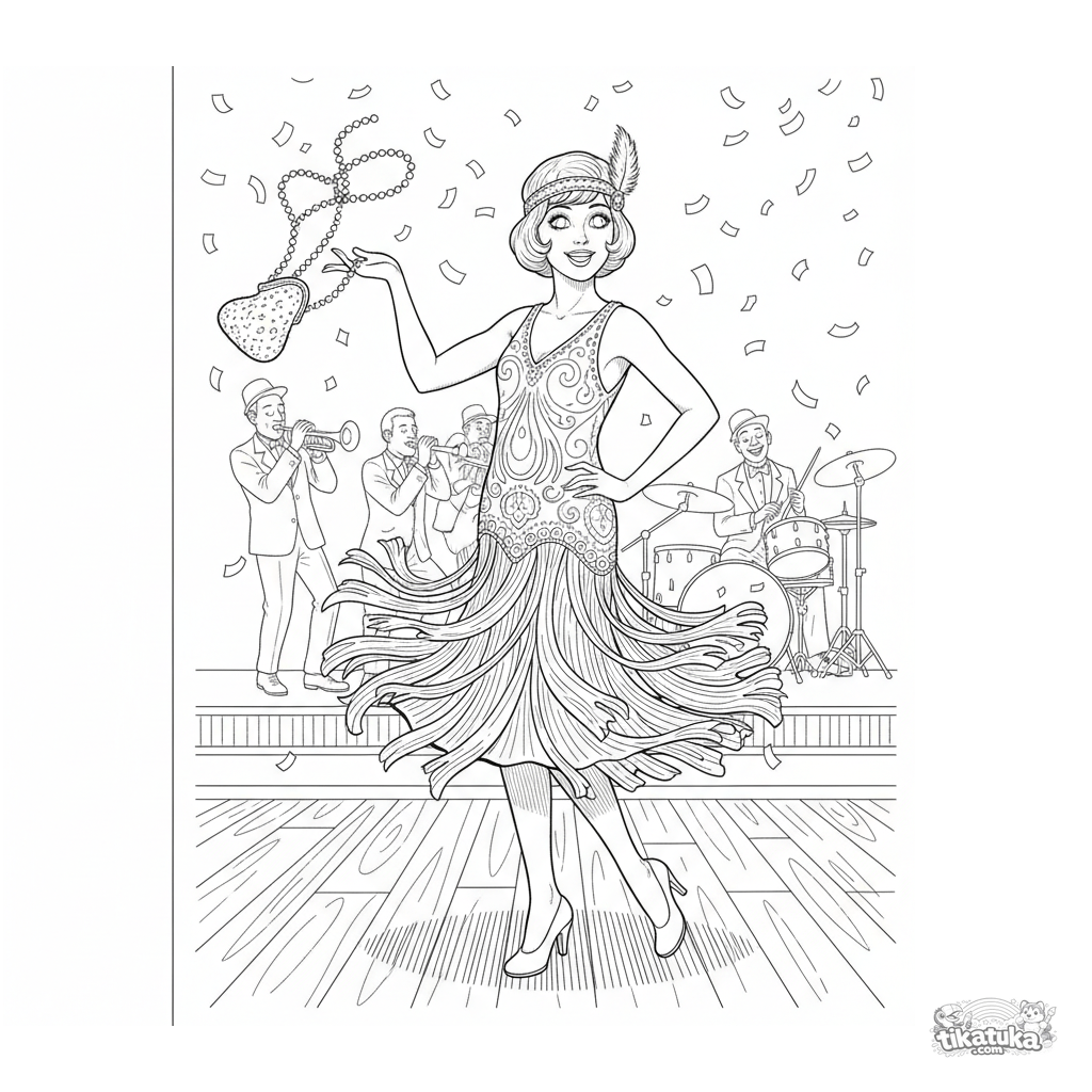 Komplexes Ausmalbild für 10-12 Jahre: Mädchen in 1920er Flapper-Kleid wirbelnd auf einer Speakeasy-Tanzfläche. Dynamische Szene mit Band, Konfetti und historischen Details.