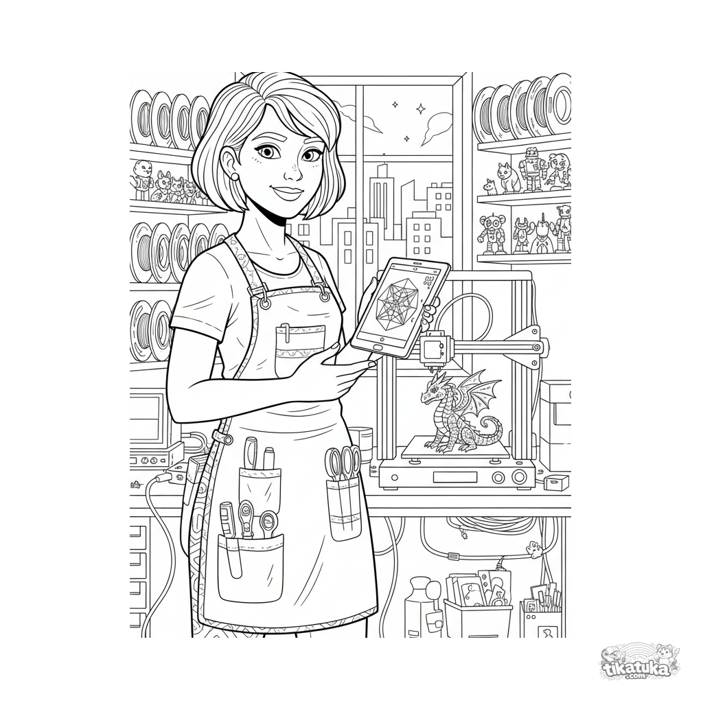 Ausmalbild für Kinder von 10-12 Jahren: ein Bediener beobachtet einen 3D-Drucker bei der Arbeit im Hacker-Keller. Details: Filamentspulen, fertige Drucke, Tablet mit Design, Werkbank.