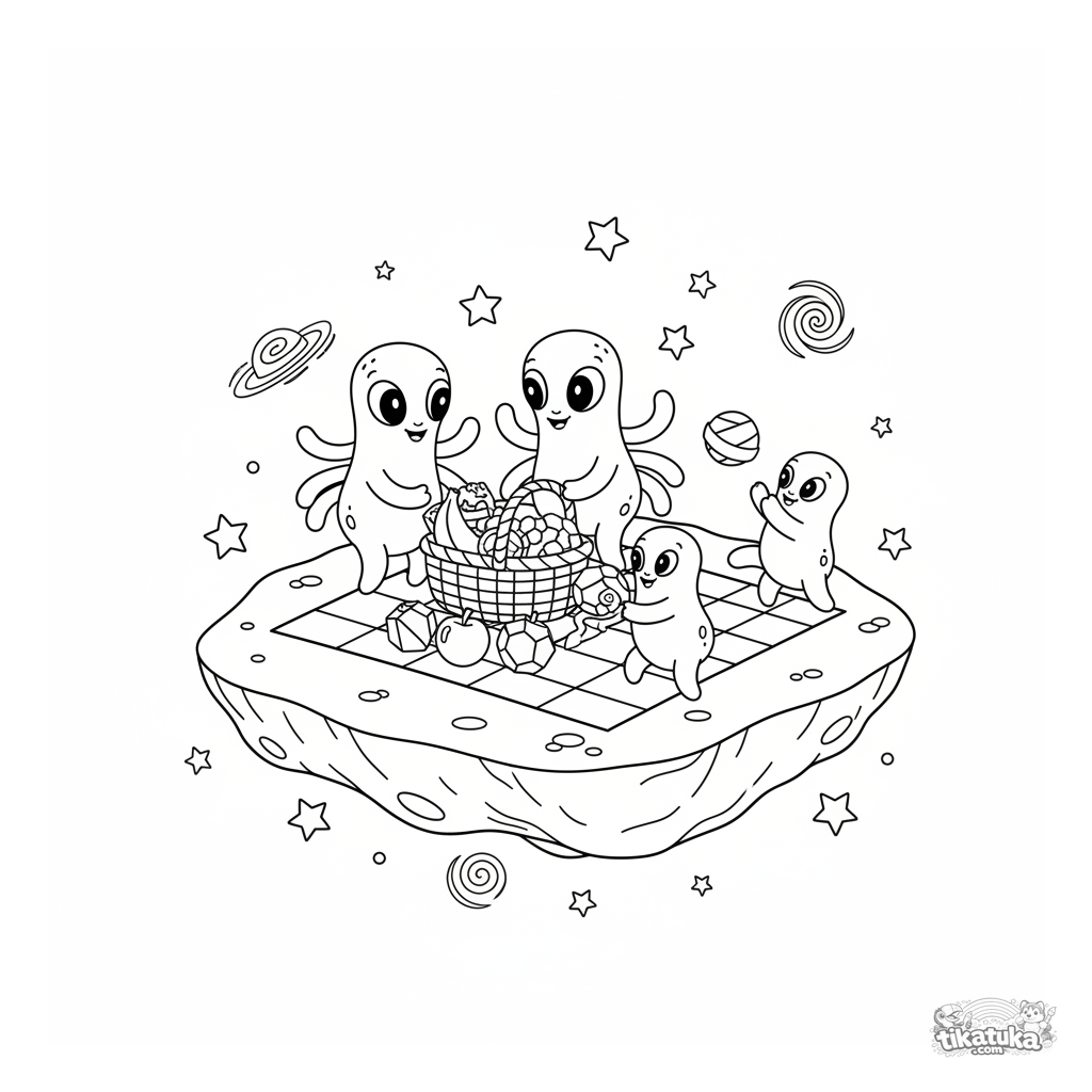 Ausmalbild für 7-9 Jahre: Eine süße Alien-Familie macht ein Picknick auf einem kleinen Asteroiden im Weltall. Szene mit mehreren Figuren und Details.