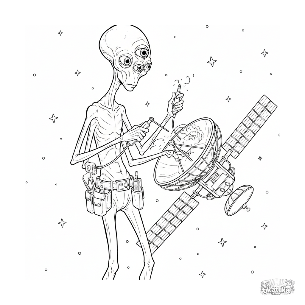 Ausmalbild für 10-12 Jahre: Eine detaillierte Szene eines außerirdischen Mechanikers, der eine Satellitenschüssel im Weltraum zwischen Sternen repariert. Komplexe technische Ausmalszene.