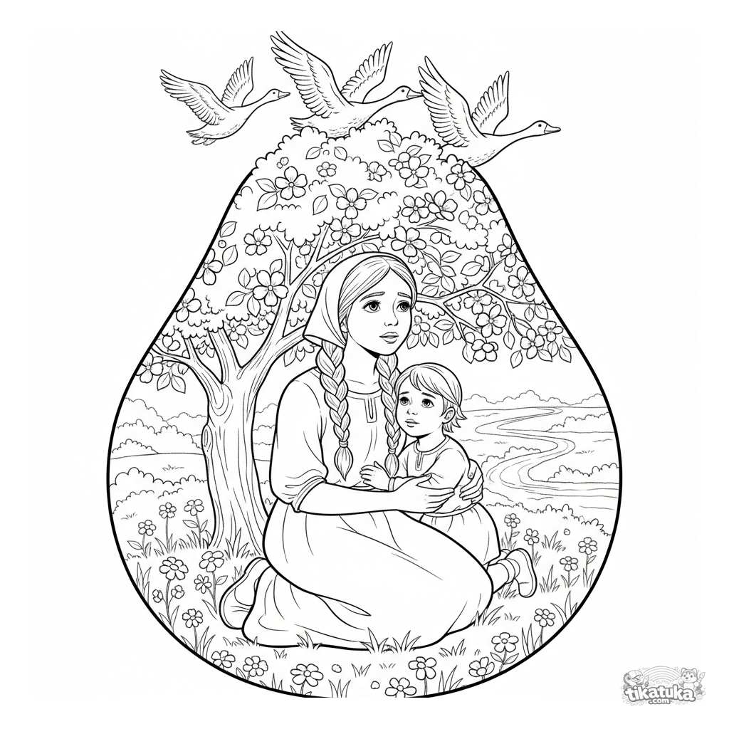 Ausmalbild aus 'Gänse-Schwäne': Alyonushka versteckt sich mit ihrem Bruder unter einem Apfelbaum. Für 5-9 Jahre. Waldszene mit fliegenden Gänsen.