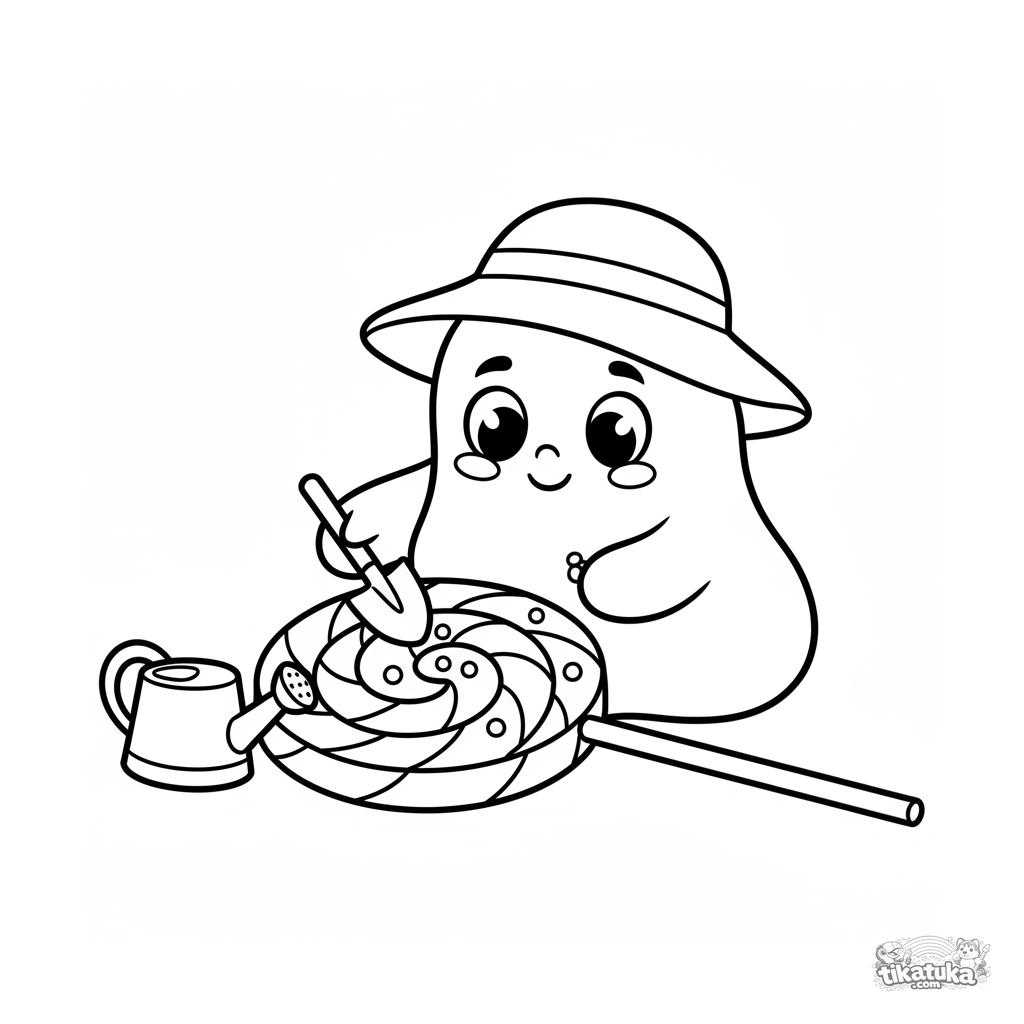 Einfaches Ausmalbild für Kleinkinder 2-3: Eine große, freundliche Amöbe mit Hut pflanzt Blumen auf einem Lollipop. Große Formen, wenige Details, breite Ränder.