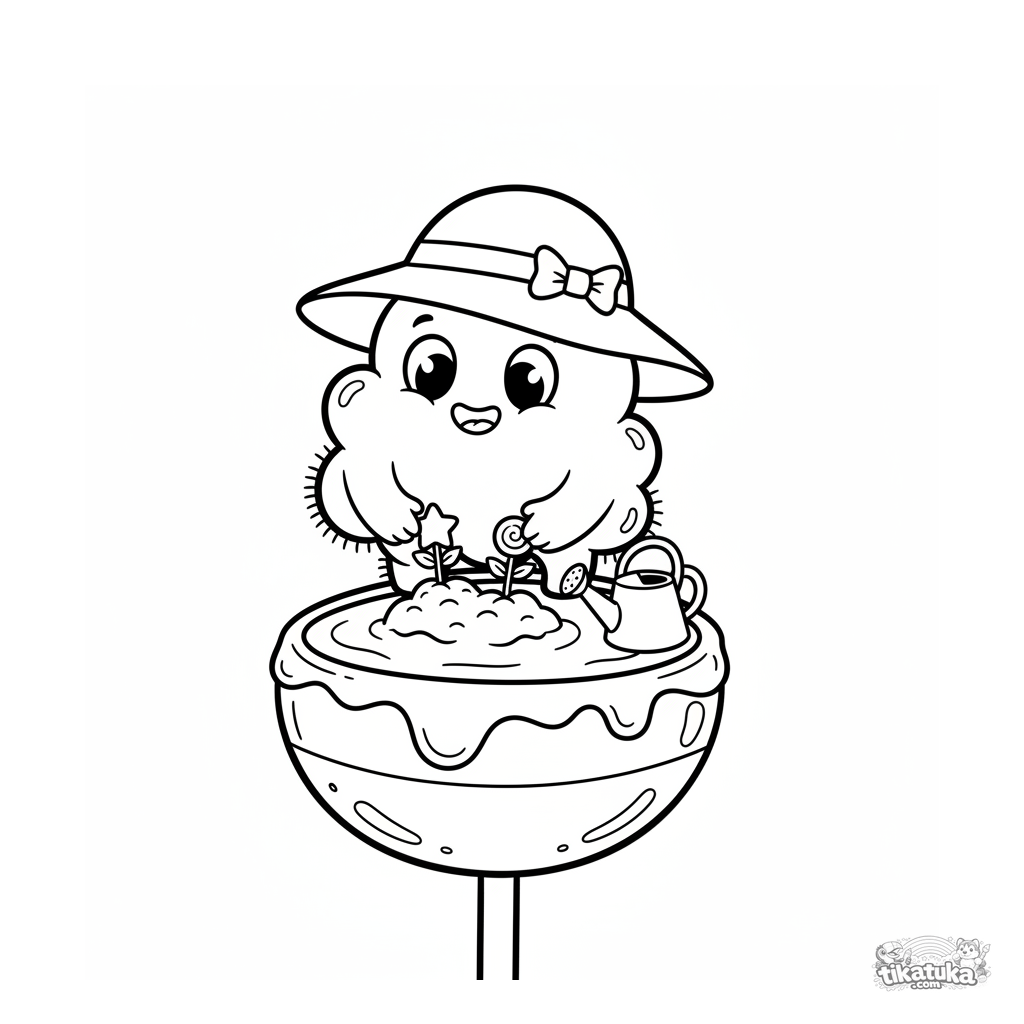Einfaches Ausmalbild für Kleinkinder 2-3: Eine freundliche Amöbe mit Hut pflanzt Süßigkeiten-Sprossen auf einem Lollipop. Große Formen, wenige Details.