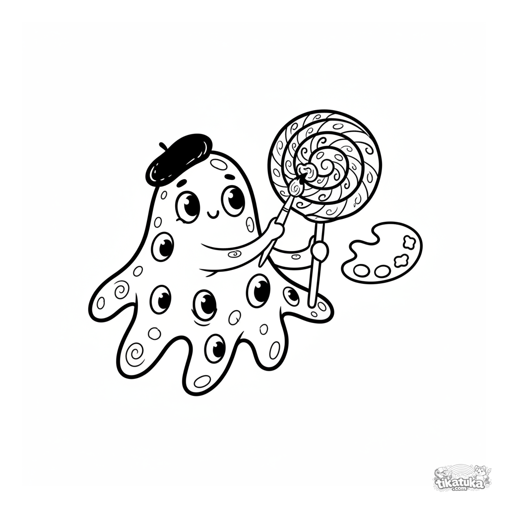 Ausmalbild für ältere Kinder 10-12: Eine amöbenförmige Mikrobe malt Muster auf einen Lollipop. Detaillierte Szene mit Palette und Pinseln.