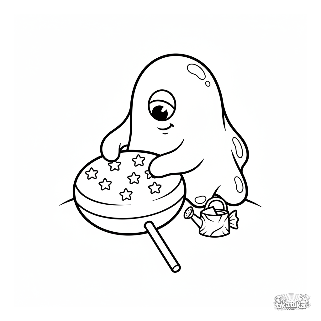 Einfaches Ausmalbild für Kleinkinder 2-3: Eine große, sanfte Amöbe pflanzt magische Sprösslinge auf einer Lolli-Oberfläche. Große Formen, wenige Details.