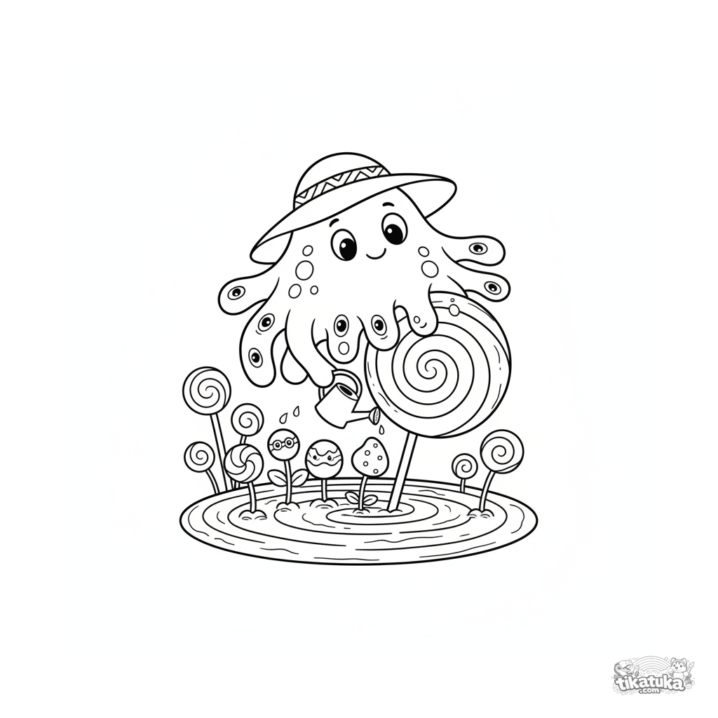 Ausmalbild für Kinder 4-6: Eine fröhliche Amöben-Gärtnerin mit Sonnenhut gießt Süßigkeiten-Sprossen auf der Oberfläche eines hellen Lollipops. Niedliche Mikroben.