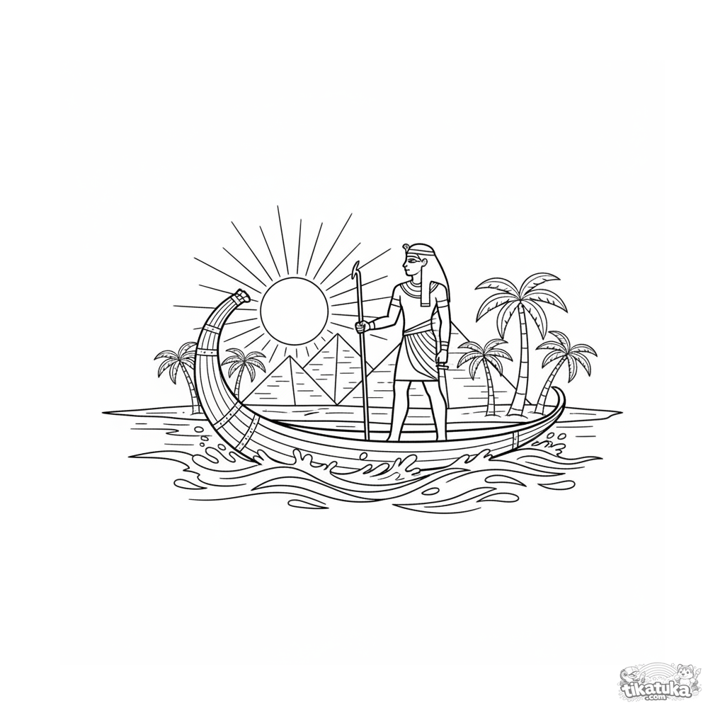 Ausmalbild für Tweens 7-9: ein altägyptisches Schilfboot segelt auf dem Nil bei Sonnenuntergang. Detaillierte Szene mit Pyramiden im Stil eines alten Stichs.