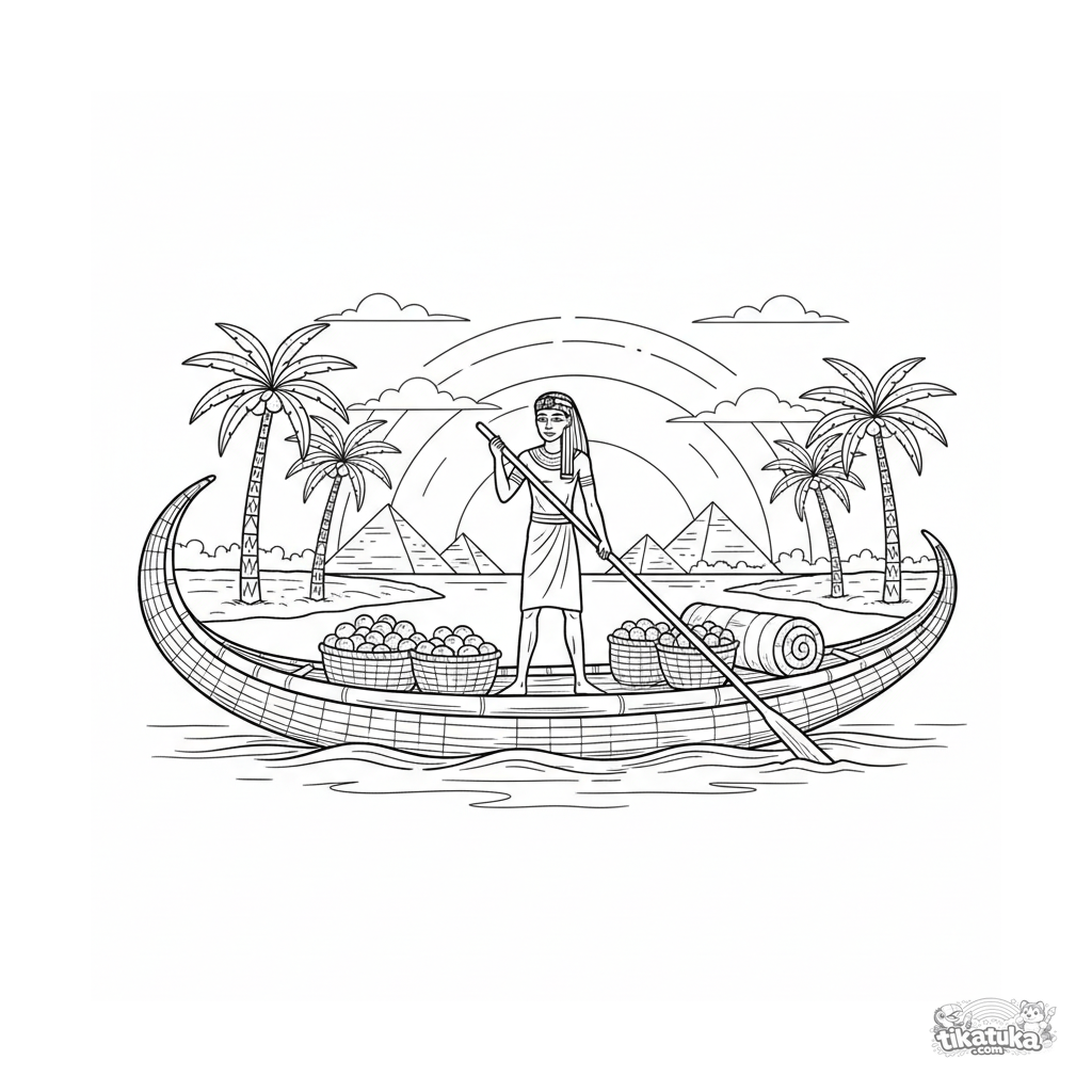 Ausmalbild für Tweens 7-9: Ein altägyptisches Papyrus-Schilfboot fährt bei Sonnenuntergang auf dem Nil. Steuernde Figur, Dattelkörbe und ferne Pyramiden am Ufer.