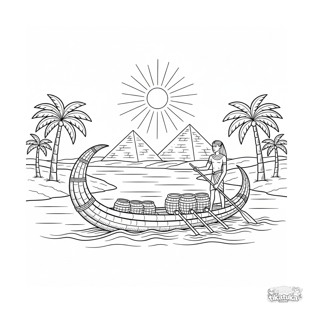 Ausmalbild für Tweens 7-9: Ein altes ägyptisches Schilfboot segelt auf dem Nil. Pyramiden, Palmen und historische Details ergeben eine lehrreiche Szene zum Ausmalen.