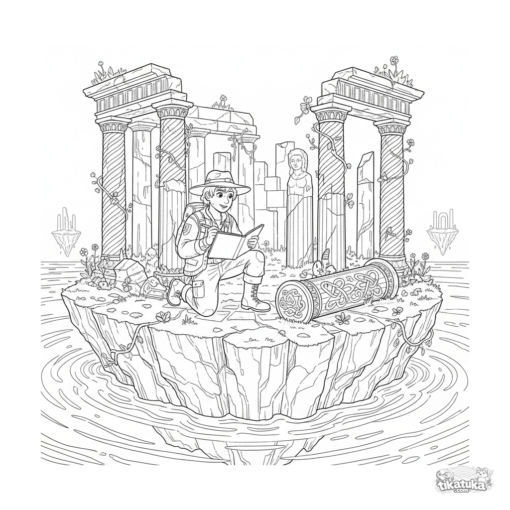 Ausmalbild für 10-12 Jahre: geheimnisvolle Ruinen eines antiken Steintempels auf einer moosbewachsenen schwimmenden Plattform, wo ein Forscher alte Schnitzereien untersucht.