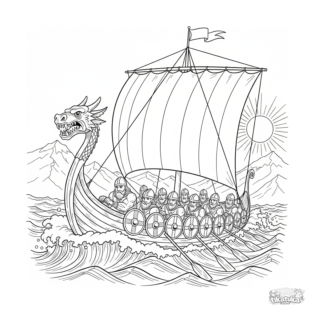 Ausmalbild für Tweens 7-9: Ein Wikinger-Langschiff mit Drachenbug fährt auf rauer See. Krieger rudern, Schilde an den Seiten. Dynamische Abenteuerszene.