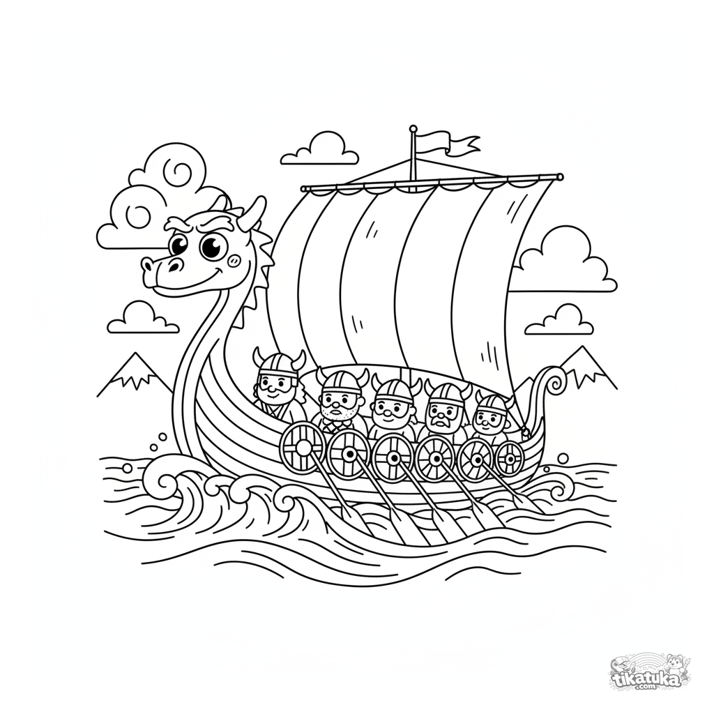 Ausmalbild für Kinder 7-9: Ein wildes Wikingerlangschiff mit Drachenbug segelt auf einem stürmischen Meer, mit blähendem Segel, Schilden an der Seite und rudernden Kriegern.