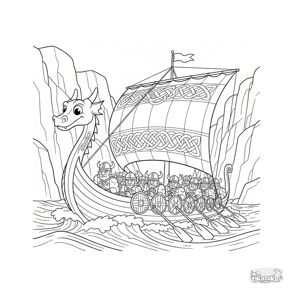 Detailliertes Ausmalbild für ältere Kinder von 10-12: ein Wikinger-Langschiff in einem stürmischen Fjord. Dynamische Abenteuer-Comic-Szene.