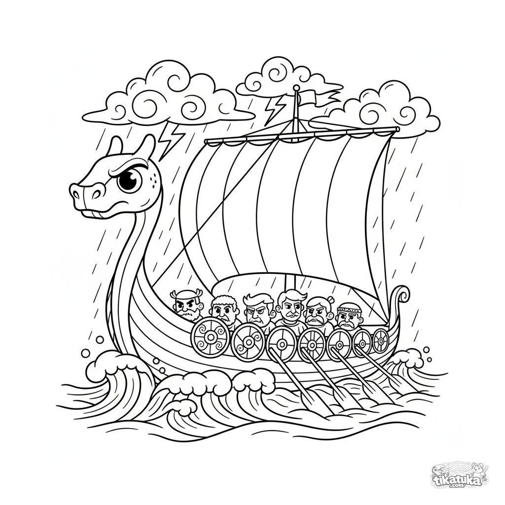 Ausmalbild für Tweens 7-9: Ein wildes Wikinger-Langschiff segelt auf einem stürmischen Meer. Dynamische Szene mit Schilden und Wellen.