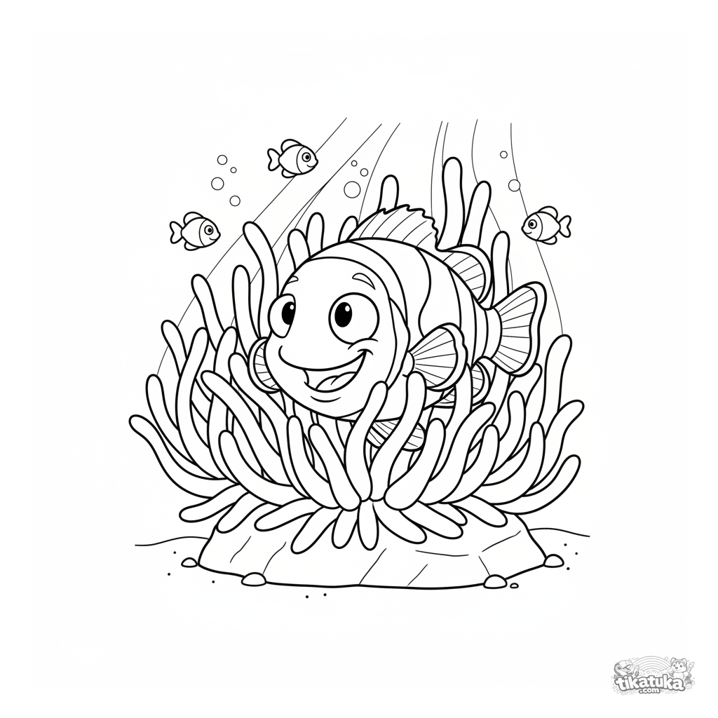 Ausmalbild für Tweens 7-9: Ein verspielter Clownfisch flitzt zwischen den Tentakeln einer Seeanemone im sonnigen Flachwasser. Dynamische Szene.
