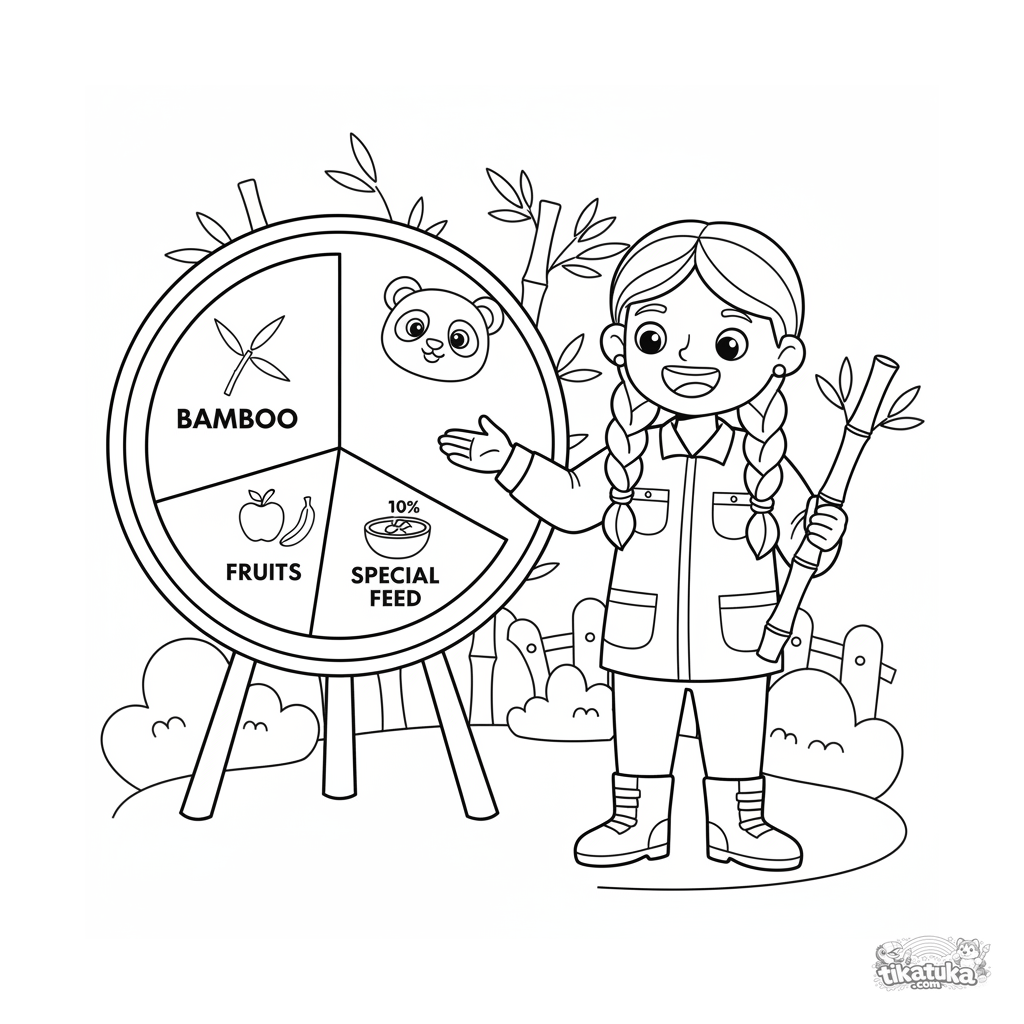 Ausmalbild für Kinder 7-9: Eine Zoopflegerin erklärt an einer Infotafel ein Tortendiagramm der Pandanahrung. Führt in Diagrammkonzepte ein.