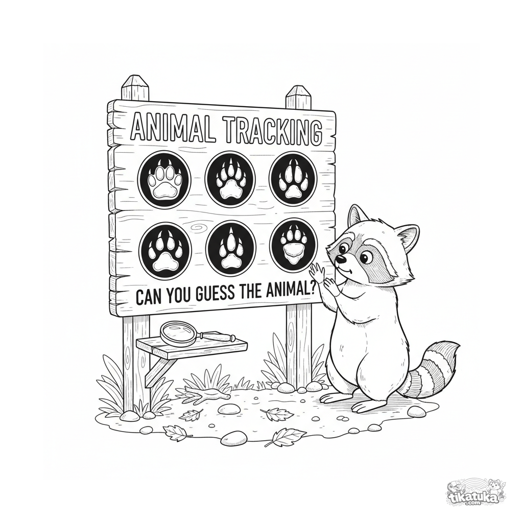 Ausmalbild für Kinder 10-12: Ein detailliertes Tierspuren-Identifikationsschild im Zoo. Ein neugieriger Waschbär untersucht die Abdrücke. Lehrreiche Szene.
