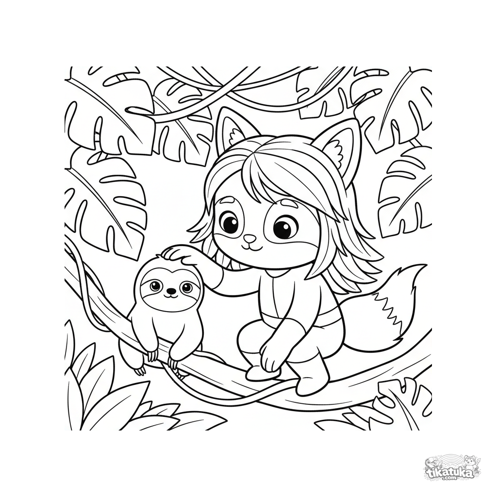 Einfaches Ausmalbild für Kleinkinder 2-3: Ein Tierkraftheld mit Fuchsohren trifft ein winziges Faultier auf einer Liane im dichten Dschungel.