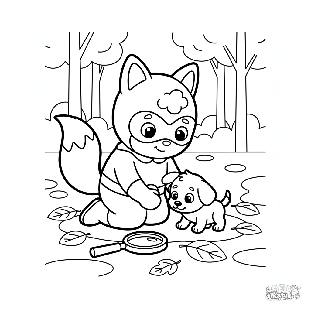 Einfaches Ausmalbild für Kleinkinder 2-3: Ein freundlicher, tiergestalteter Superheld mit Fuchsohren und -schwanz bringt einem Welpen bei, im Wald nach Hinweisen zu schnüffeln.