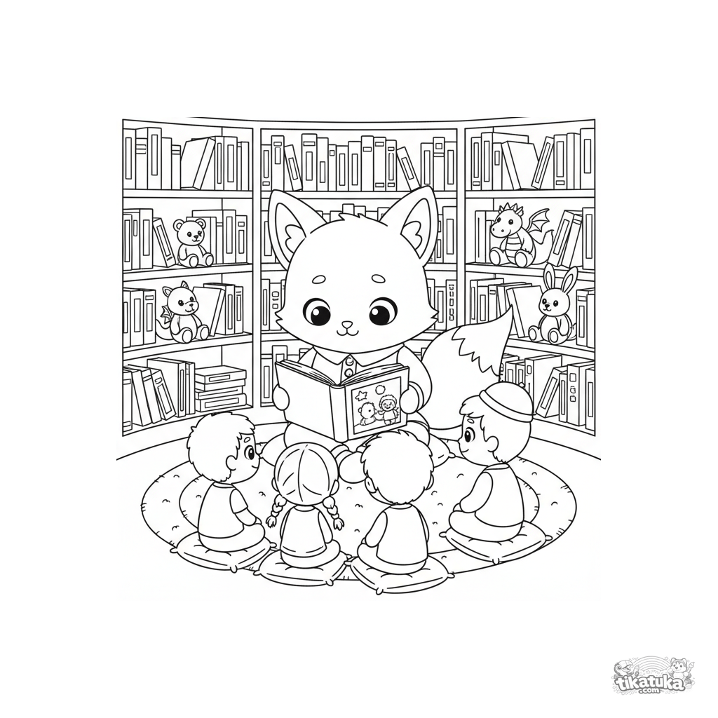 Ausmalbild eines freundlichen Tier-Superhelden mit Fuchsohren, der Kindern in einer Bibliothek vorliest. Für Kinder von 4-6 Jahren.