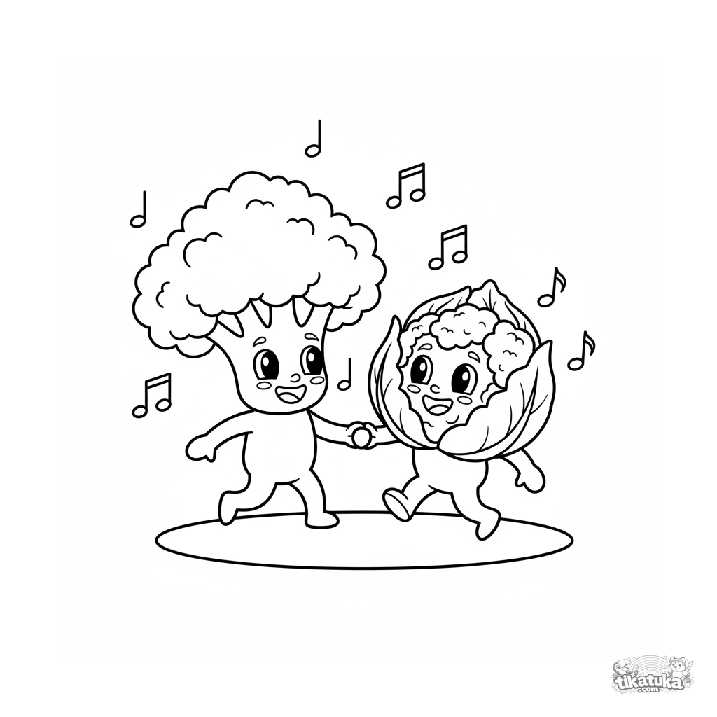Ausmalbild von fröhlichen tanzenden Brokkoli- und Blumenkohl-Charakteren. Für Kinder von 7-9 Jahren. Gemüsecharaktere halten sich an den Händen, mit schwebenden Noten.