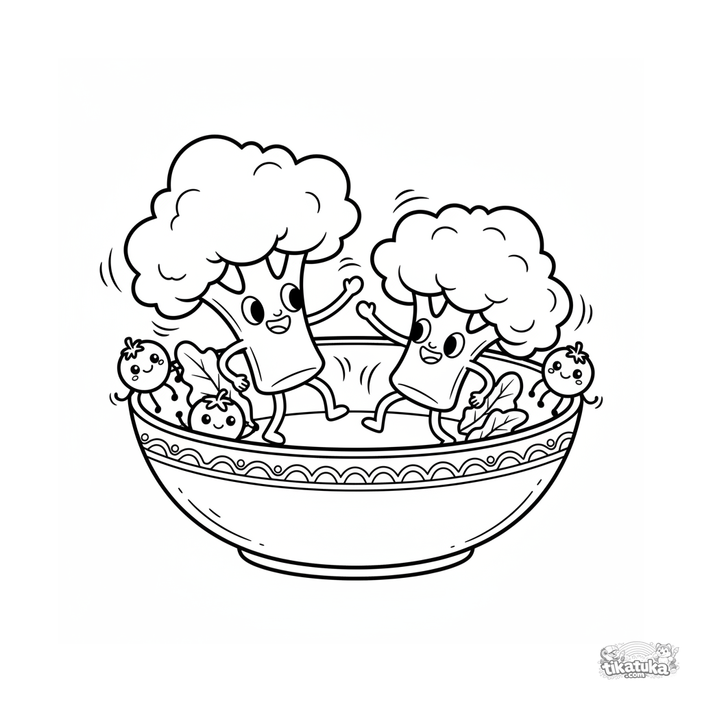 Lustiges Ausmalbild für 4-6 Jahre: Brokkoli und Blumenkohl tanzen in einer Salatschüssel. Dynamische Szene im 90er-Cartoon-Stil.