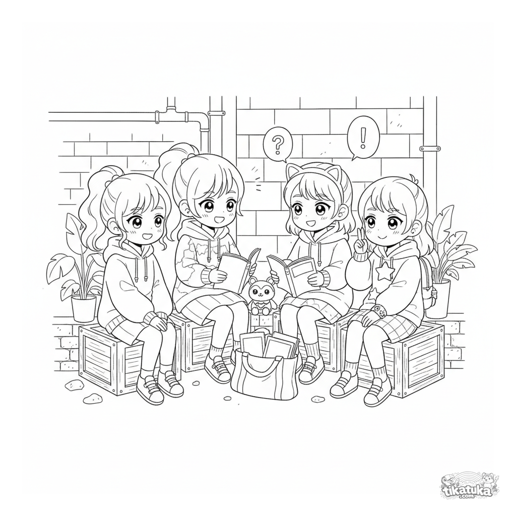 Ausmalbild für Kinder von 7-12 Jahren: Anime-Club-Freunde teilen Manga und unterhalten sich in einer detaillierten Stadtgasse.