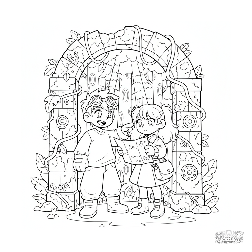 Abenteuer-Anime-Ausmalbild: Zwei Freunde erkunden von Wein überwucherte alte Ruinen in einem Wald. Szene mit detailliertem Hintergrund für Kinder 10-12.