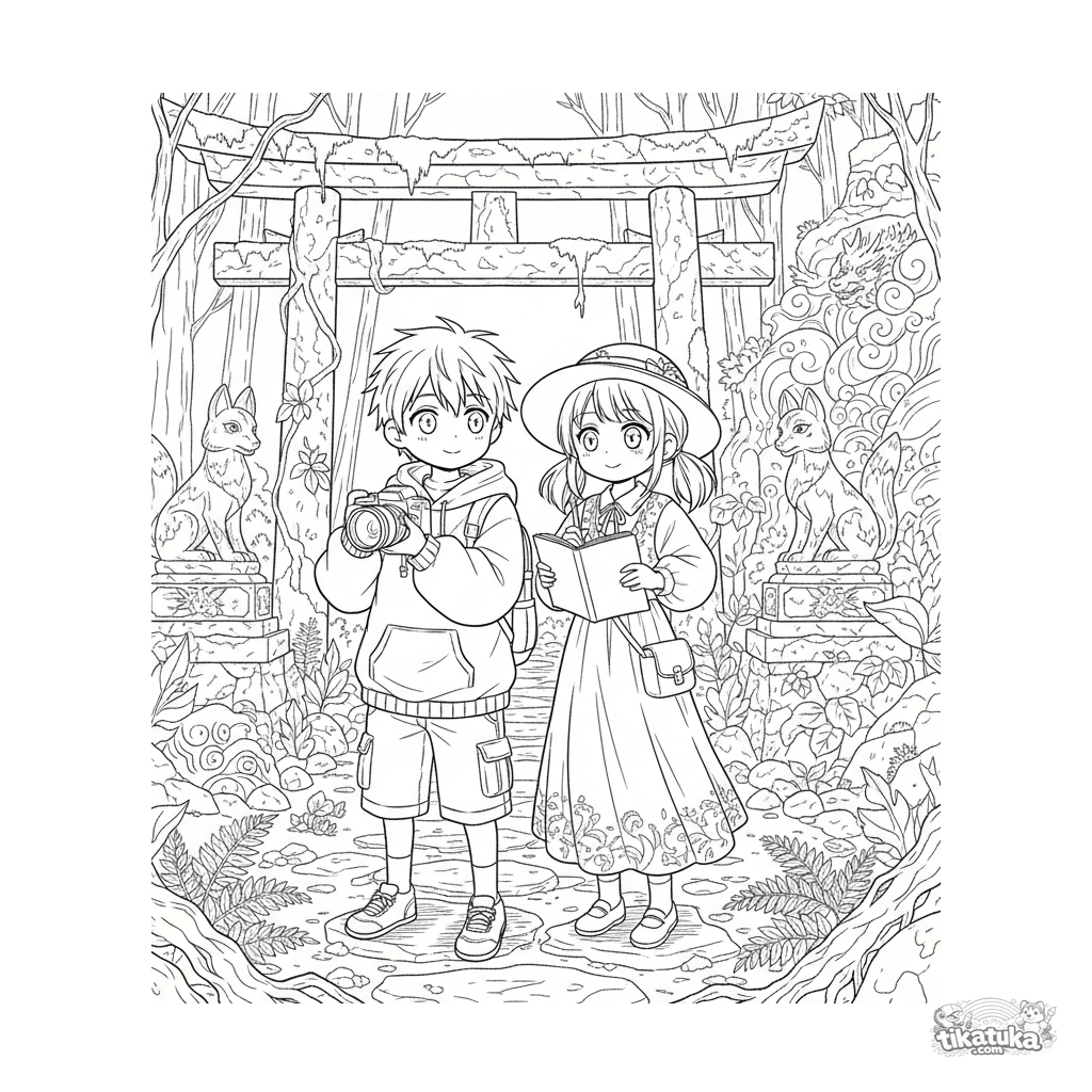 Kodomo-Anime-Ausmalbild: Zwei Freunde erkunden einen verwilderten alten Schrein im Wald. Detaillierte Szene mit Torii-Tor und Fuchsstatuen für 10-12-Jährige.