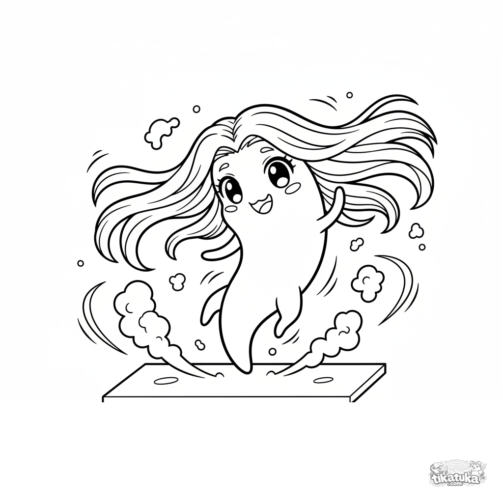 Ausmalbild für Kinder: Eine fröhliche kommaförmige Mikrobe mit langen Zilien tanzt auf einem Objektträger. Anime-Kodomo-Stil für Kleinkinder, für 4-6 Jahre.