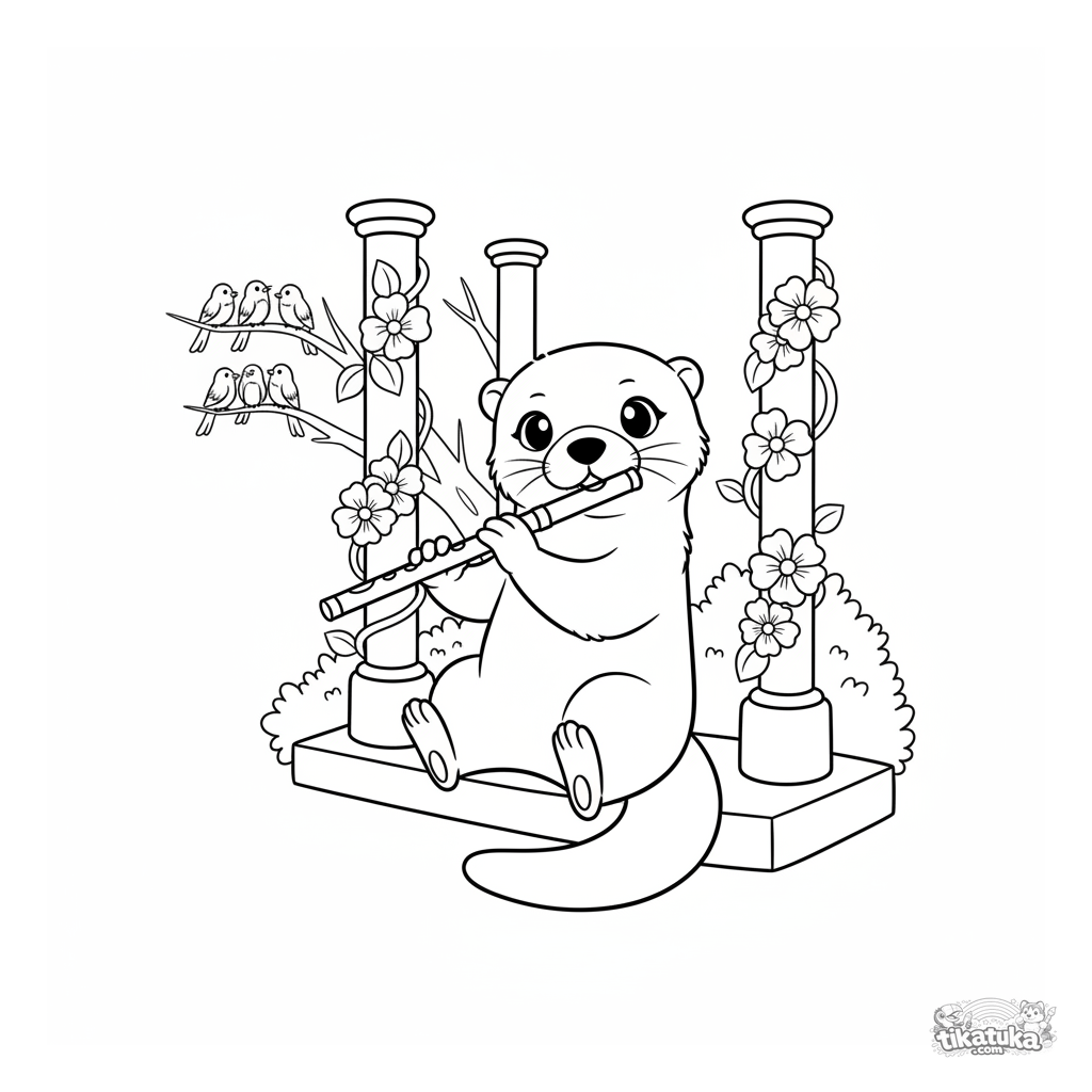 Kinder-Ausmalbild: ein Otter spielt Flöte in einem Park-Musikpavillon. Eine ruhige und schöne Szene mit Blumen und Vögeln.