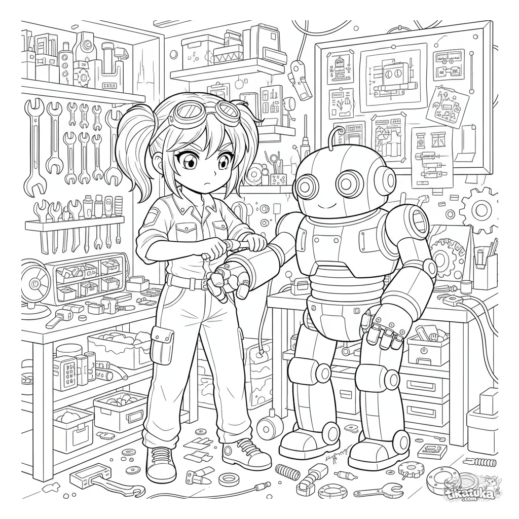 Anime-Ausmalbild für 10-12 Jahre: Eine Mechanikerin repariert einen großen Roboter in einer detaillierten Werkstatt voller Werkzeuge und Blaupausen.