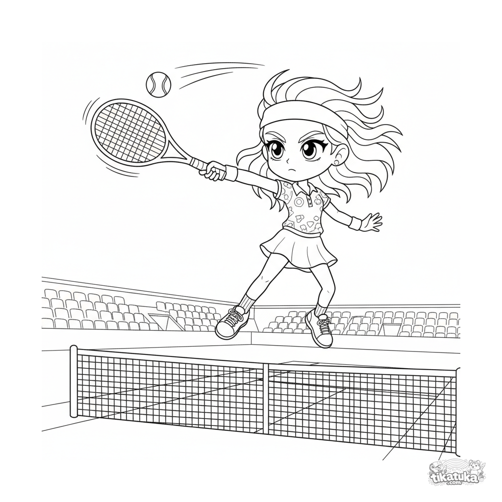 Cooles Anime-Stil Ausmalbild für ältere Kinder 10-12: Ein Tennisspieler in einem kraftvollen Sprung am Netz für einen Volley. Energische Linien.