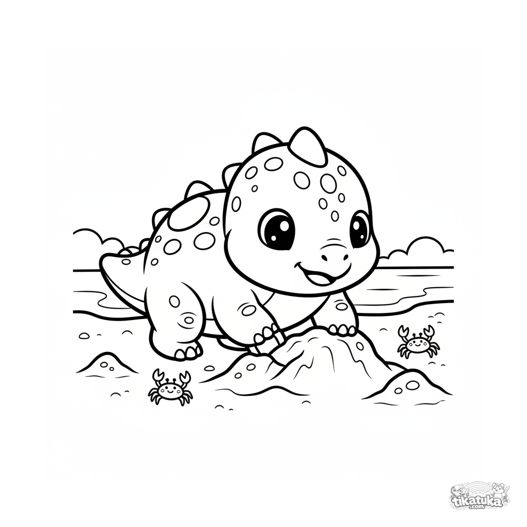 Ausmalbild für Kleinkinder 2-3 Jahre: Ein Baby-Ankylosaurus gräbt im Sand eines uralten Ozeanstrands. Einfache große Formen, breite Ränder zum Ausmalen.
