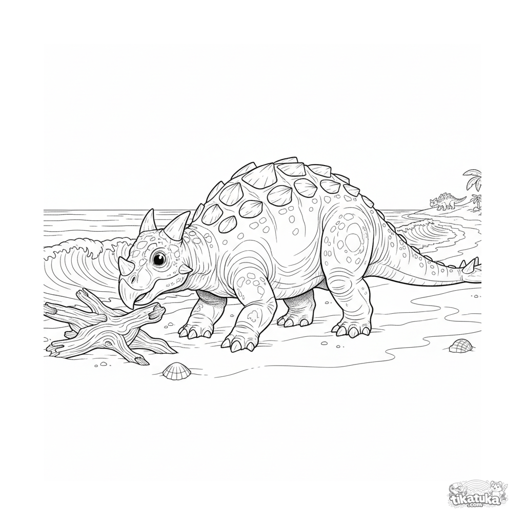 Ausmalbild für 10-12 Jahre: Ein detaillierter Ankylosaurus erkundet eine uralte Ozeanküste und sammelt Treibholz. Realistischer Stil.
