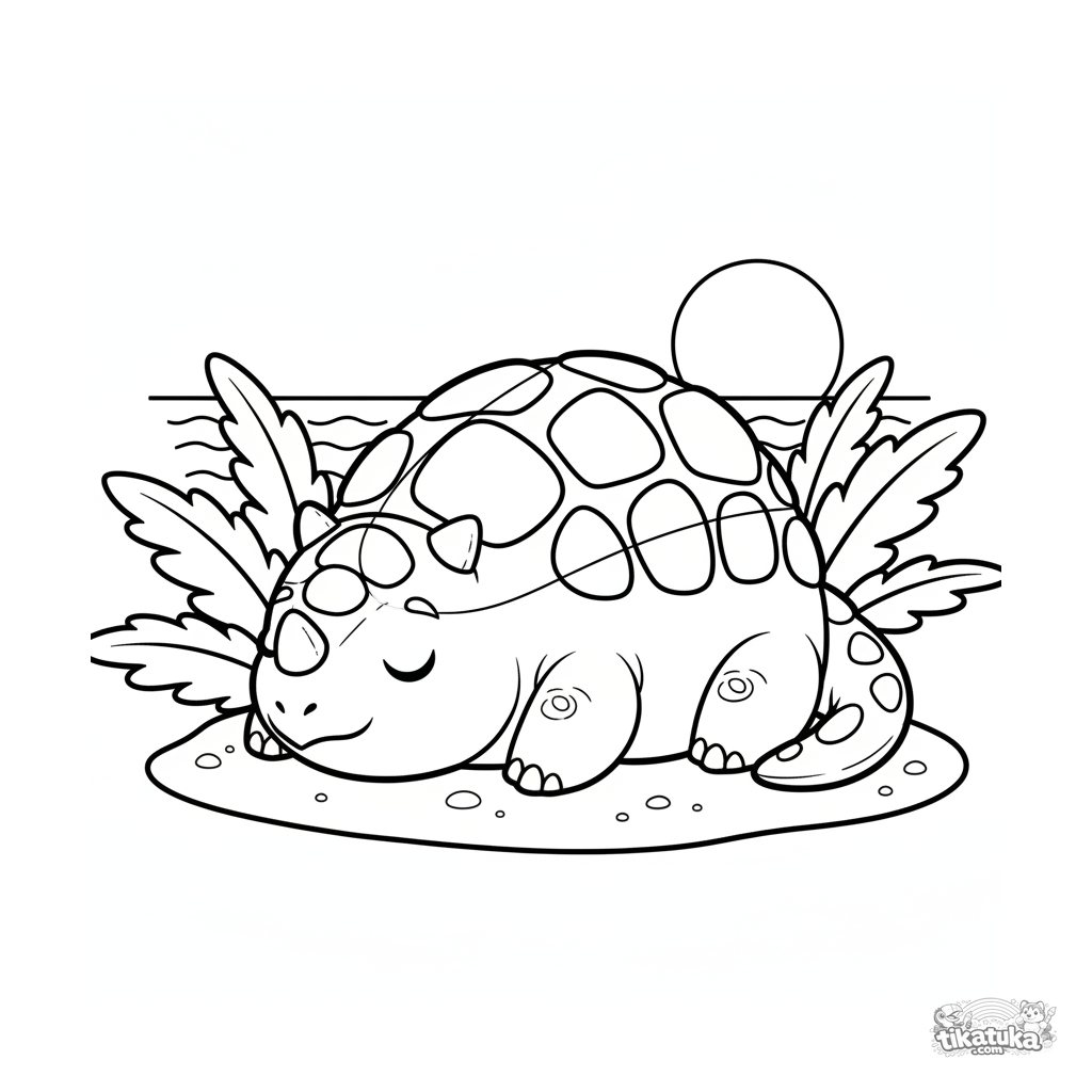 Kleinkind-Ausmalbild 2-3 Jahre: Ein großer, kuscheliger Ankylosaurus döst friedlich auf dem warmen Sand eines uralten Strandes. Einfache, große Formen.