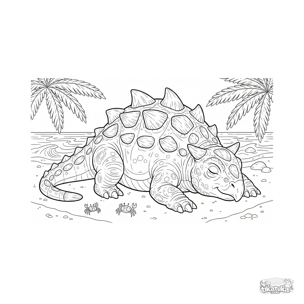 Detailliertes Ausmalbild für 10-12 Jahre: Ein Ankylosaurus schläft friedlich auf dem sonnigen Sand eines urzeitlichen Ufers.