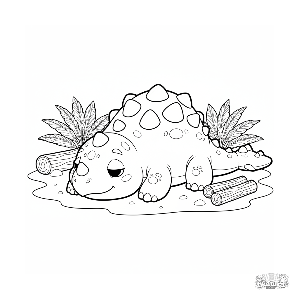 Ausmalbild für Kinder 7-9: ein pummeliger Ankylosaurus sonnt sich friedlich auf der Seite im warmen Sand eines urzeitlichen Strandes. Gemütliche und niedliche Szene.
