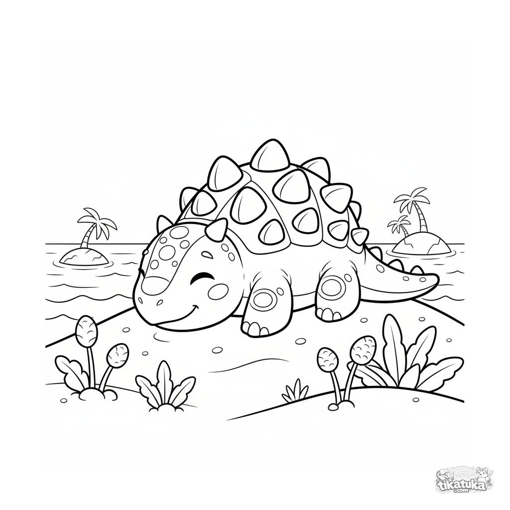 Ausmalbild für Kinder 7-9: Ein pummeliger Ankylosaurus sonnt sich auf einer Sanddüne am urzeitlichen Ozean. Klare Umrisse, friedliche Szene.