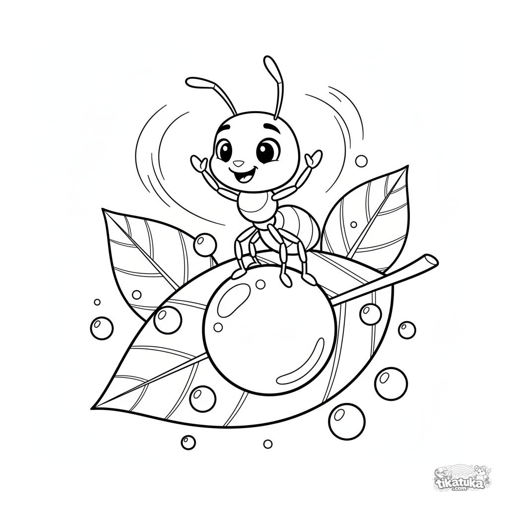 Ausmalbild für 7-9 Jahre: eine fröhliche Ameise versucht, das Gleichgewicht zu halten, während sie auf einem runden Tautropfen auf einem großen grünen Blatt steht.