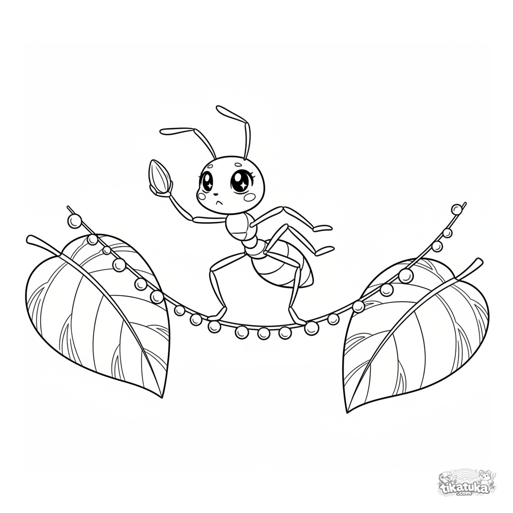 Detailliertes Ausmalbild für ältere Kinder 10-12: Eine Akrobaten-Ameise läuft auf einem Tautropfen-Seil zwischen Blättern. Detaillierte Anime-Kodomo-Umrisse, mehrschichtige Szene, ausdrucksstarke Emotion.