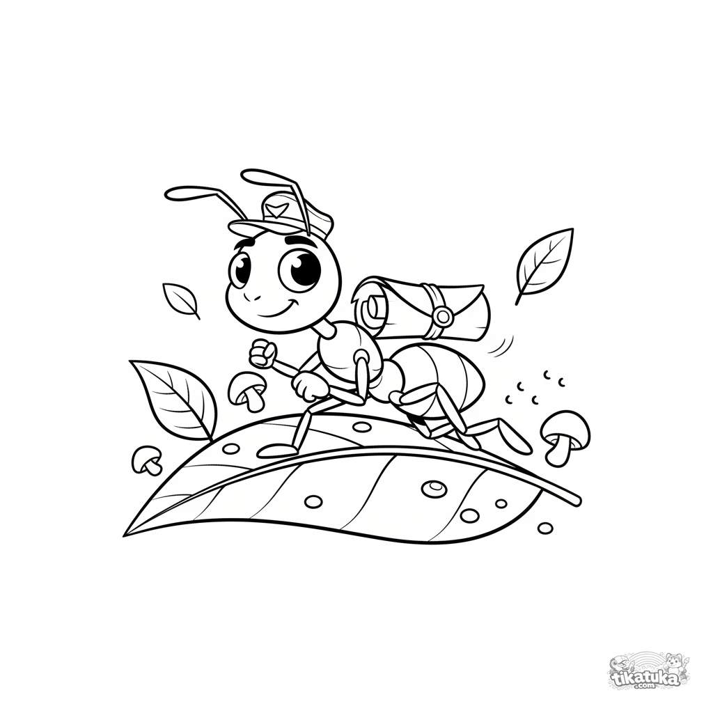 Ausmalbild für 7-9 Jahre: ein Ameisen-Kurier mit Postmütze liefert eilig einen Brief über ein großes, taufeuchtes Blatt. Dynamische Szene.