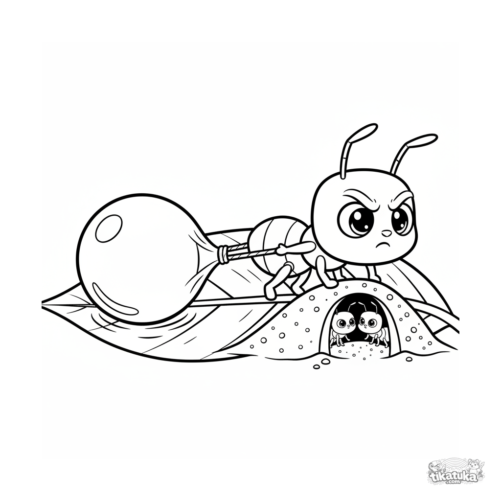 Ausmalbild für Kinder 7-9: Eine Ameise in dynamischer Pose zieht einen großen Tautropfen zu ihrem Ameisenhaufen am Blattgrund. Szene im Comic-Abenteuer-Stil.
