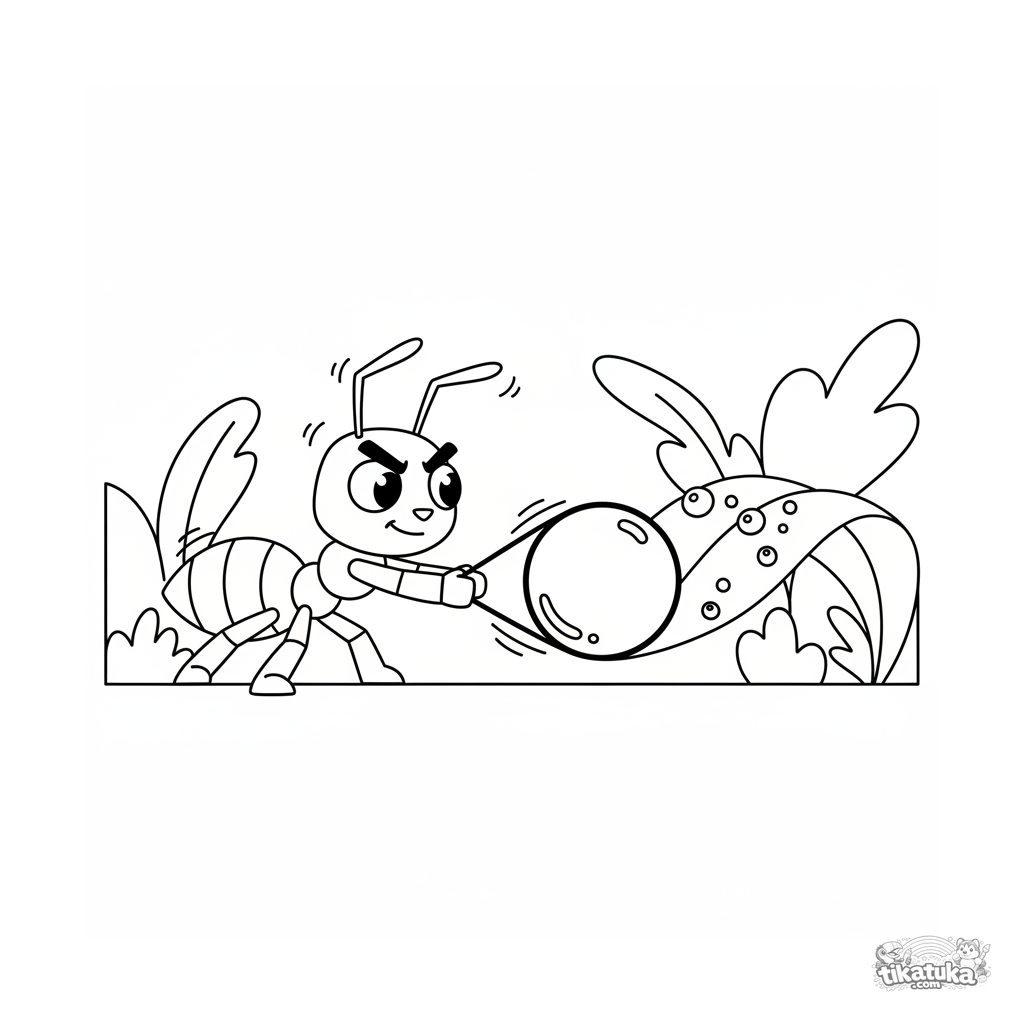 Ausmalbild für Tweens 7-9: Eine fleißige Ameise versucht, einen großen Tautropfen am Blattrand zu bewegen. Dynamische Insektenszene im Comic-Stil.