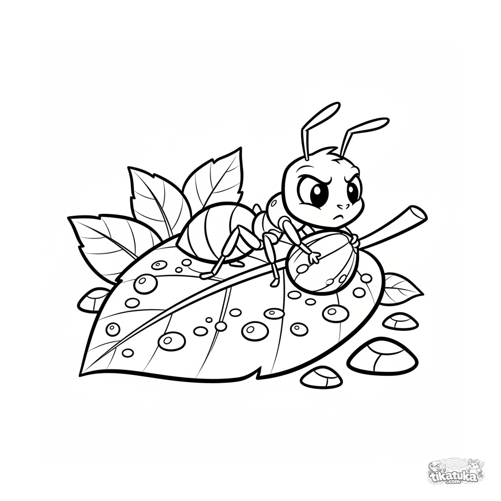 Ausmalbild für 7-9 Jahre: Eine fleißige Ameise zieht einen großen Samen über ein Blatt und umgeht Tautropfen. Dynamische Szene aus dem Insektenleben.
