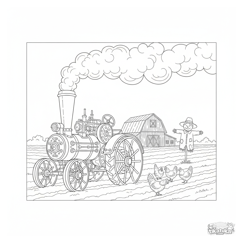 Detailliertes Ausmalbild eines antiken Dampftraktors, der ein Feld pflügt. Für Jungen von 8 bis 12 Jahren. Realistischer Stil.